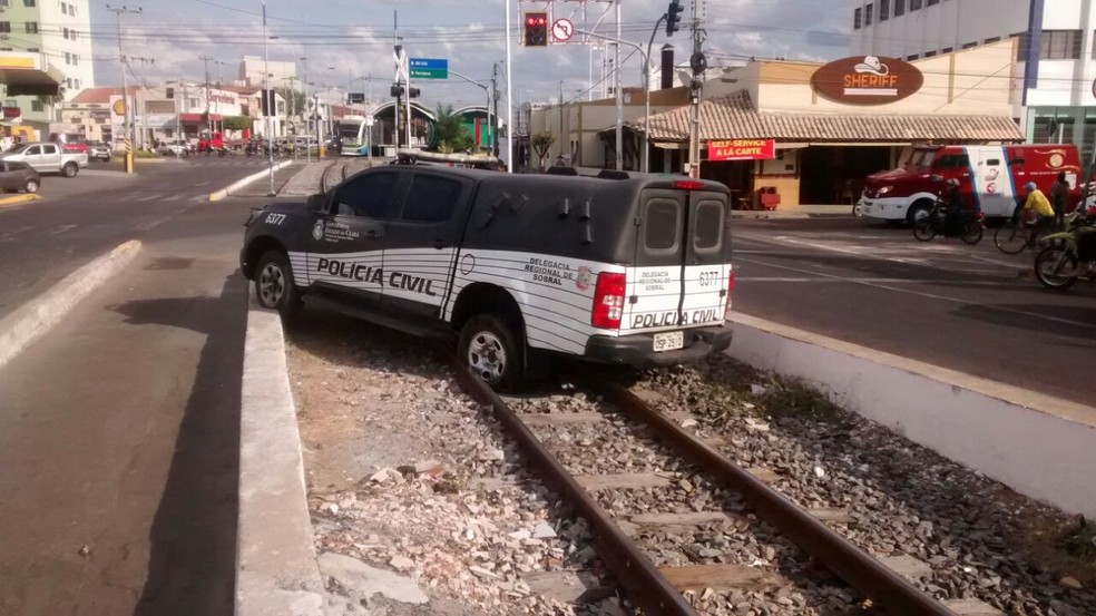 Um carro da Polícia Civil do Ceará ficou sem freio e foi parar sobre a via férrea de Sobral após uma manobra do policial motorista. O veículo havia acabado de sair da manutenção em uma oficina de Fortaleza, onde estava há quatro meses, e apresentou defeito novamente com a falta de freio nesta segunda-feira (16).