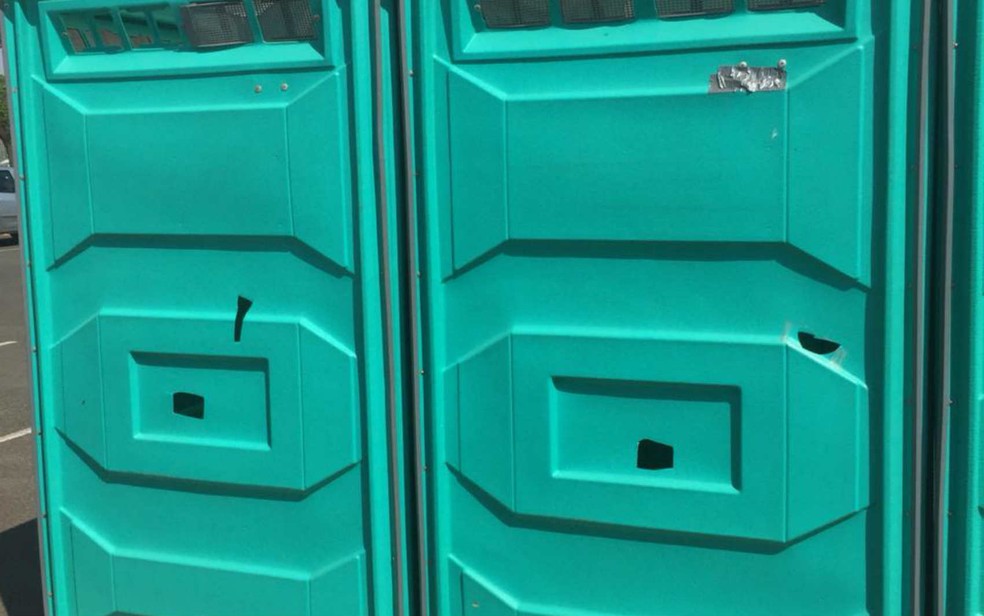 Banheiros químicos perfurados por homem detido no Parque da Cidade, em Brasília — Foto: Polícia Militar/Divulgação