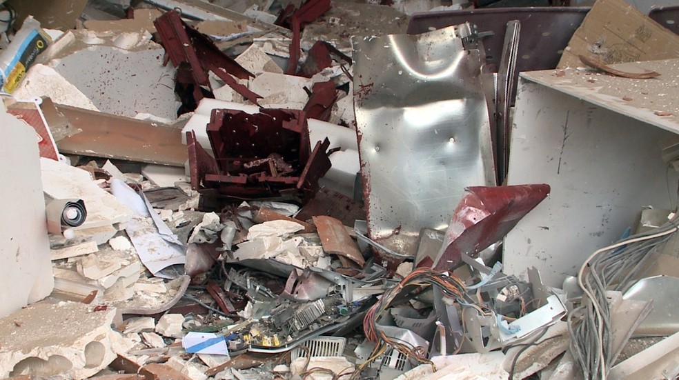 Equipamentos do posto de atendimento ficaram espalhados no local onde funcionava o banco no Sertão paraibano — Foto: Beto Silva/TV Paraíba