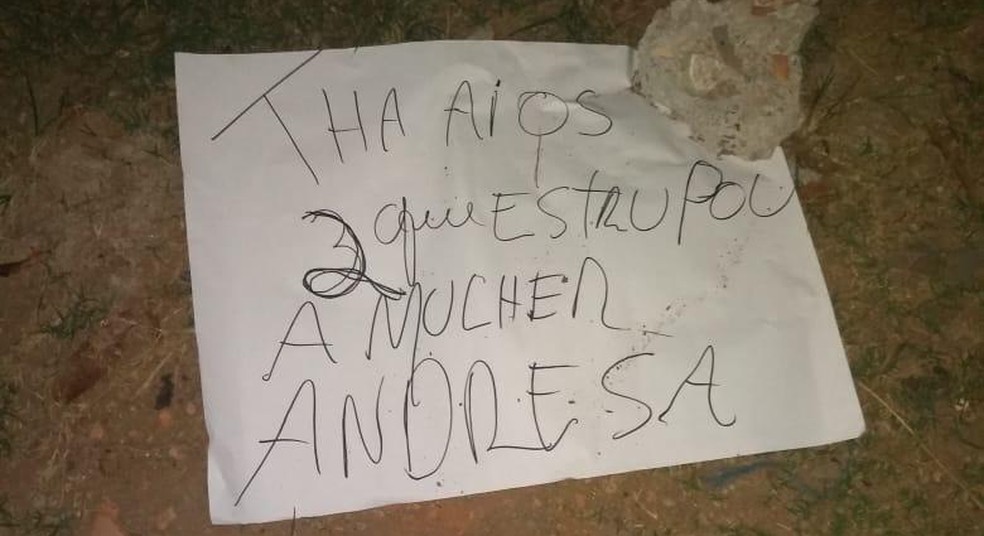 Um bilhete com a frase "Tha ai os 2 que estrupou a mulher Andresa (sic)" foi encontrado no sábado (4) perto dos corpos na Rua Espírito Santo.