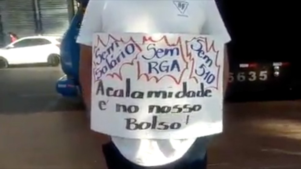 "Sem salário, sem RGA, a calamidade é no nosso bolso", diz um dos cartazes.